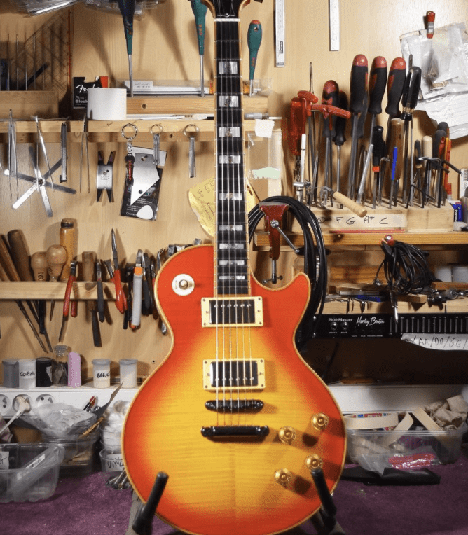• 2010 Les Paul handmade by Delzona Guitars, mahogany body, maple top, ebony fingerboard with abalone and mother-of-pearl, custom green-yellow-red binding, Seymour Duncan Humbucker pickups, personalised headstock
